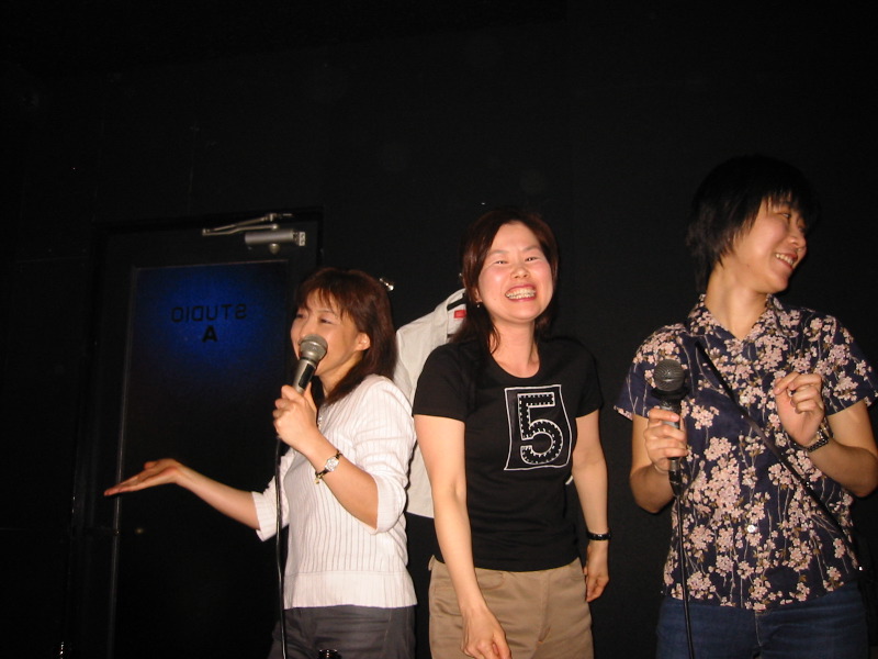 Apre had a single (reservable) Karaoke room. We'd settle in for the evening and work the selection in the Karaoke machine. The teachers and staff from Eurocentres often came along, as seen here where the Senseis Three (Yamamori-sensei, Kojima-sensei, and Osada-sensei) perform.