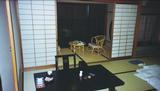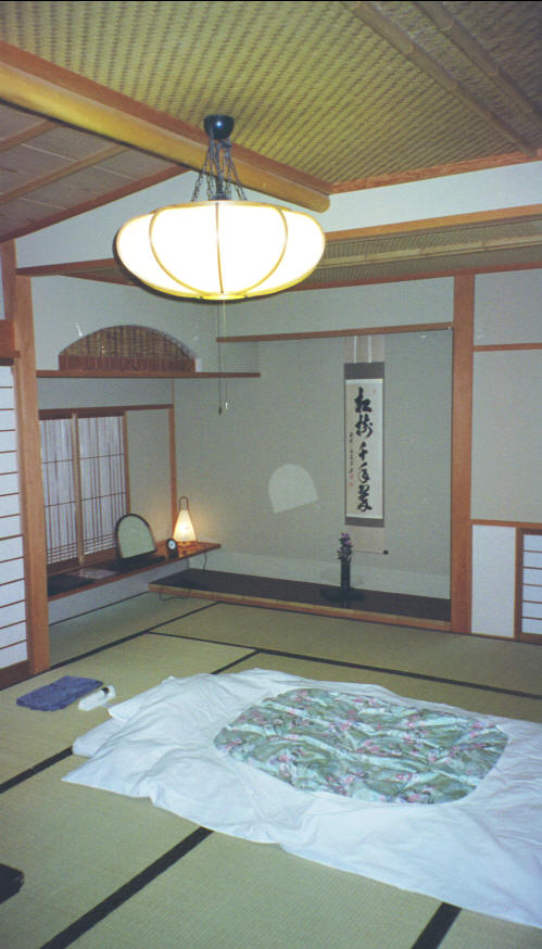 While you're off at the baths, your room attendant will change your main living area from an eating room to a sleeping room. Here's what you'll see when you get back - a futon spread out on the floor of this amazing space. Note the traditional alcove with hanging scroll and ikebana flower arrangement behind the futon. Photography geeks should also note how the semicircular mirror next to the lamp reflected the flash onto the wall! | ![]() |